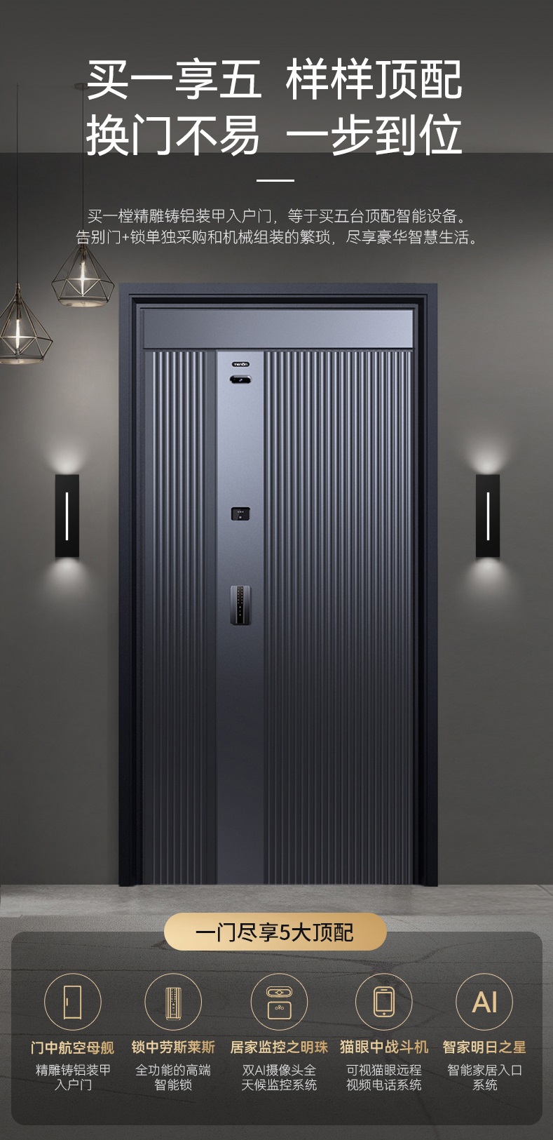 一门尽享5大顶配:精雕铸铝装甲入户门+全功能的高端智能锁+双AI摄像头全天候监控系统+可视猫眼远程视频电话系统+智能家居入口系统。